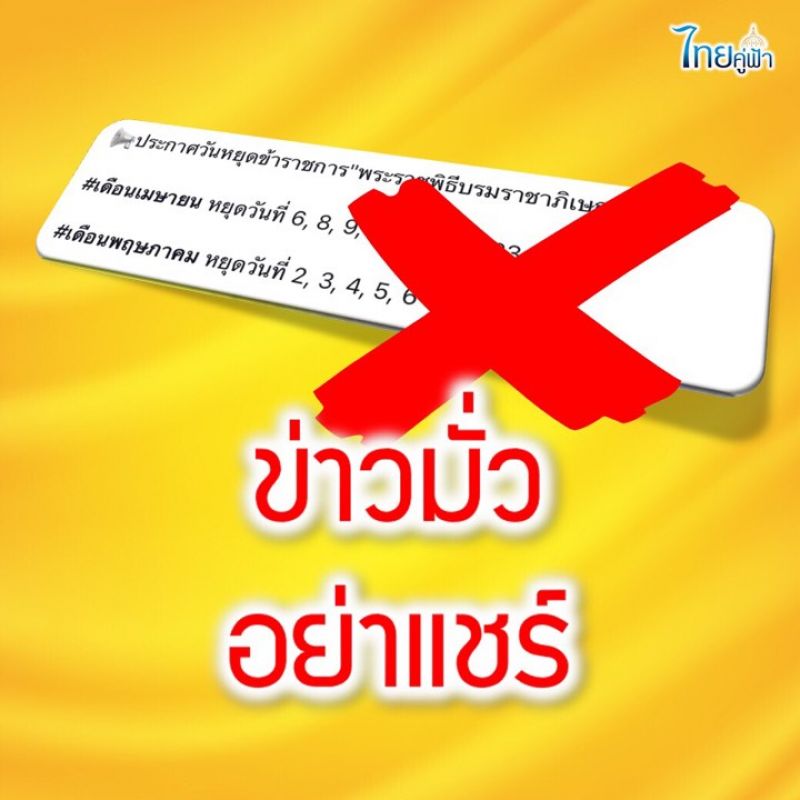 ตามที่มีข่าวลือเรื่องวันหยุด "พระราชพิธีบรมราชาภิเษก" ช่วงเดือน เม.ย. - พ.ค. ติดต่อกันหลายวัน ขอยืนยันว่า คณะรัฐมนตรีได้ประกาศวันหยุดราชการพิเศษ ช่วงเทศกาลสงกรานต์ 1 วัน คือ วันศุกร์ที่ 12 เม.ย. 62 รวมวันหยุดช่วงสงกรานต์ทั้งสิ้น 5 วัน (12 - ​16 เม.ย. 62)