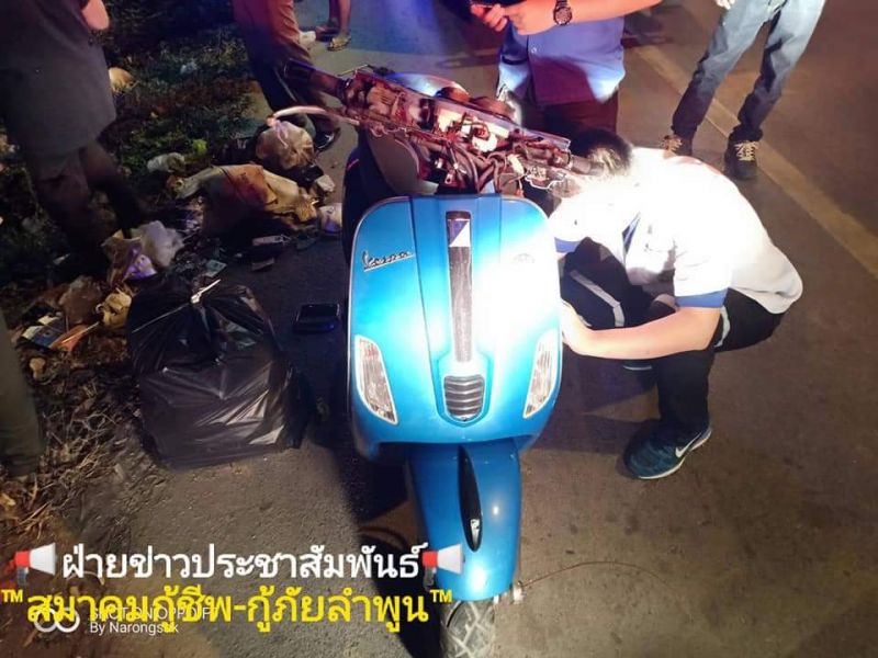 เมื่อถึงที่เกิดเหตุพบรถจักรยานยนต์เวสป้าสีฟ้าเเฉลบลงไปข้างทางห่างจากรถประมาณ 5 เมตร พบผู้ได้รับบาดเจ็บชาย 1 รายนอนหมดสติ ทางเจ้าหน้าที่สมาคมฯได้ทำ CPR (ปั๊มหัวใจ) ที่จุดเกิดเหตุ เเละเเจ้งเจ้าหน้าที่กู้ชีพระดับสูงโรงพยาบาลลำพูนออกร่วมในที่เกิดเหตุ