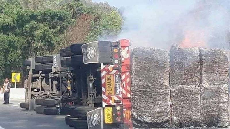รถบรรทุกเสียหลักพลิกคว่ำไฟไหม้ทางลงดอยขุนตาล ไปลำปาง