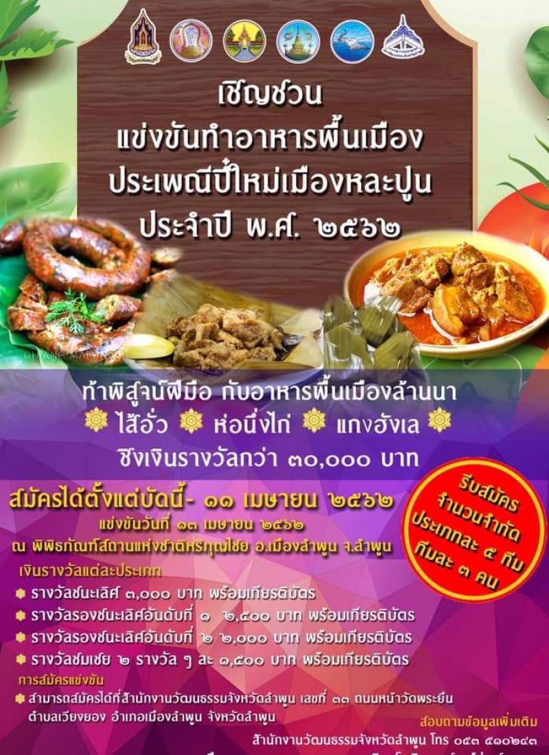 สำนักงานวัฒนธรรมจังหวัดลำพูน เชิญชวนแข่งขันทำอาหารพื้นเมือง “ประเพณีปี๋ใหม่เมืองหละปูน ประจำปี พ.ศ ๒๕๖๒” ผู้สนใจสามารถสมัครได้ที่สำนักงานวัฒนธรรมจังหวัดลำพูน โทร ๐๕๓-๕๑๐๒๔๓ ตั้งแต่บัดนี้-๑๑ เมษายน ๒๕๖๒