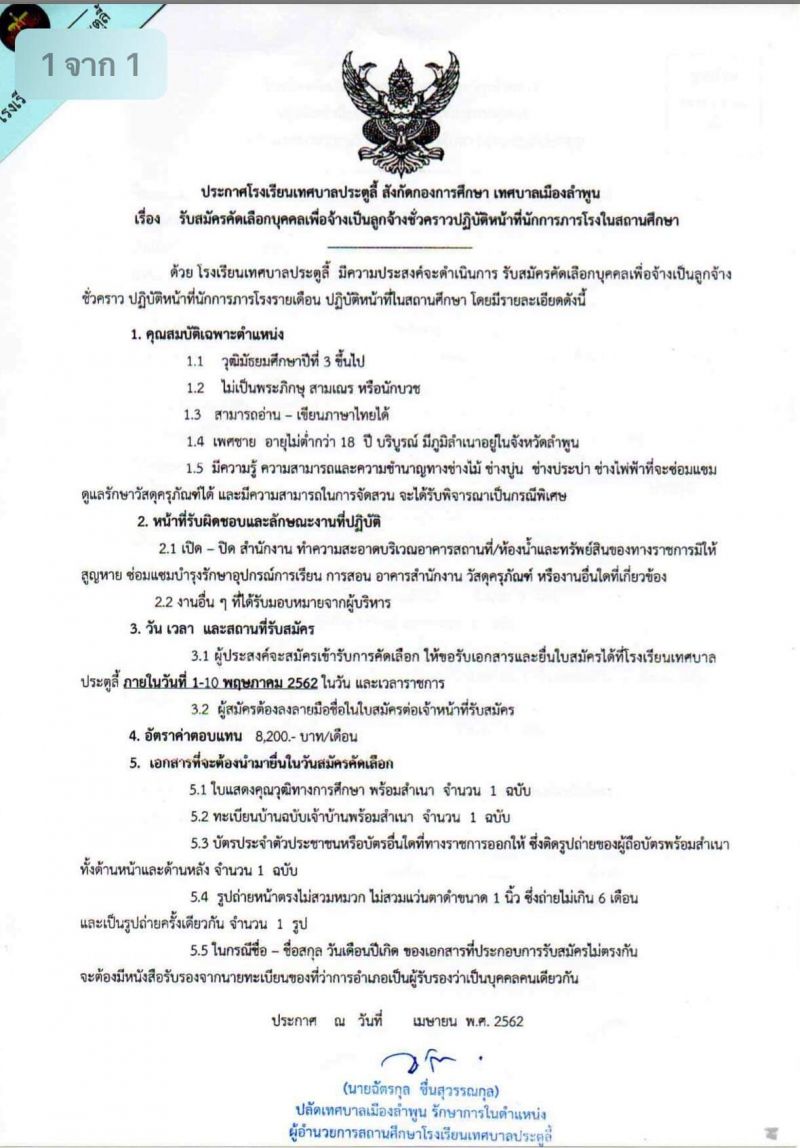 ประกาศ โรงเรียนเทศบาลประตูลี้อำเภอเมืองจังหวัดลำพูน รับสมัครพนักงานภารโรง เงินเดือน 8,000 บาท วุฒิม3 อายุ 18 ปีขึ้นไป สมัครได้ที่โรงเรียนเทศบาลประตูลี้ตั้งแต่วันที่ 1 พฤษภาคมถึงวันที่ 10 พฤษภาคม 2562