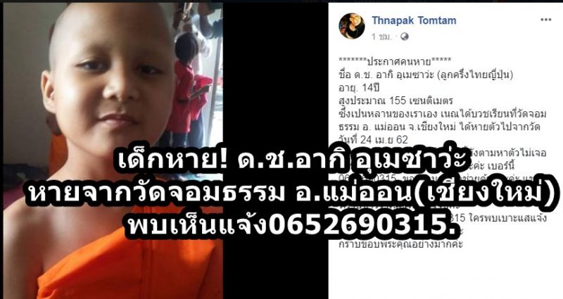 เด็กหาย! ด.ช.อากิ อุเมซาว่ะ หายจากวัดจอมธรรม อ.แม่ออน(เชียงใหม่) พบเห็นแจ้ง0652690315.