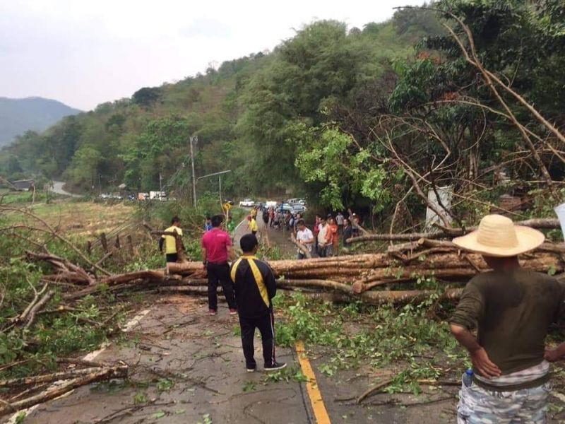 พายุฤดูร้อนเข้า อ.แม่วาง เสาไฟฟ้าต้นไม้ล้มขวางถนน