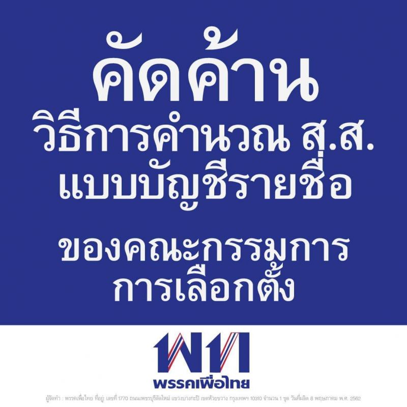 ค่ำวันนี้ พรรคเพื่อไทย ได้โพสต์แถลงการณ์คัดค้าน การคำนวณ สส แบบบัญชีรายชื่อ ที่ทางกกต. ประกาศออกมา โดย post ข้อความดังนี้