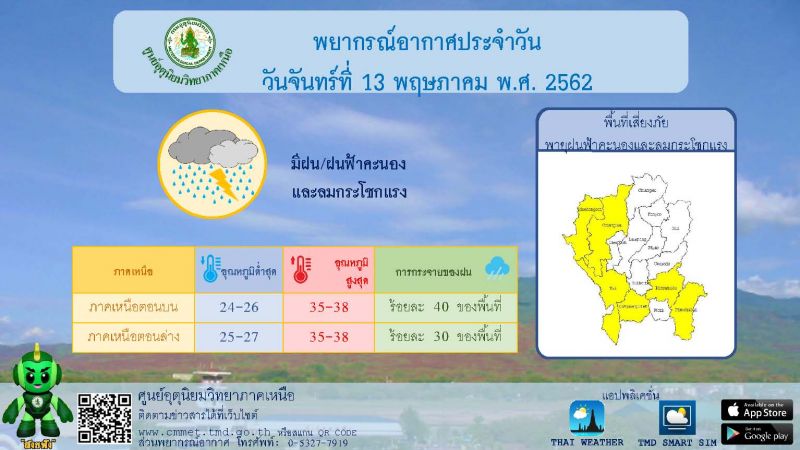 ในช่วงวันที่ 12 - 16 พ.ค. 62 มีอากาศร้อนถึงร้อนจัด โดยมีพายุฝนฟ้าคะนองกับลมกระโชกแรง ร้อยละ 30-40 ของพื้นที่ และฝนตกหนักบางพื้นที่ อุณหภูมิต่ำสุด 24-28 องศาเซลเซียส อุณหภูมิสูงสุด 37-41 องศาเซลเซียส ส่วนในช่วงวันที่ 17 - 18 พ.ค. 62 มีฝนฟ้าคะนอง ร้อยละ 20-30 ของพื้นที่ อุณหภูมิต่ำสุด 24-27 องศาเซลเซียส อุณหภูมิสูงสุด 35-37 องศาเซลเซียส ลมตะวันตก ความเร็ว 15-25 กม./ชม.