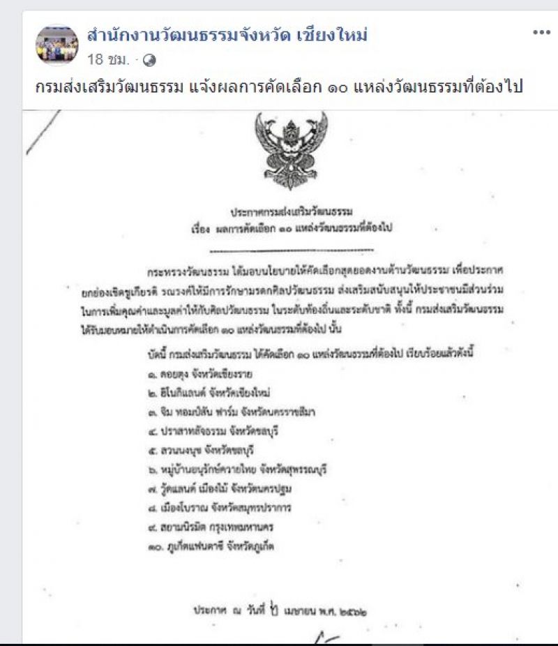 ทั้งนี้ วัฒนธรรมจังหวัดเชียงใหม่กล่าวชี้แจงว่า สำนักงานวัฒนธรรมจังหวัดเชียงใหม่และสภาวัฒนธรรมจังหวัดเชียงใหม่ ไม่ได้เสนอชื่อแหล่งท่องเที่ยวดังกล่าว ให้กรมส่งเสิรมวัฒนธรรมพิจารณาแต่อย่างใด และเมื่อสอบถามไปทางกรมถึงกรณีที่เกิดขึ้น ทางกรมได้ชี้แจงว่า การคัดเลือกดังกล่าว เป็นการพิจารณาจากผลการสำรวจความนิยมของนักท่องเที่ยวจากทั่วประเทศ อย่างไรก็ตาม ทางสำนักงานวัฒนธรรมจังหวัดเชียงใหม่และสภาวัฒนธรรมจังหวัดเชียงใหม่ จะทำหนังสือถึงอธิบดีกรมส่งเสริมวัฒนธรรม เพื่อแจ้งข้อกังวลของประชาชนชาวเชียงใหม่ที่ไม่เห็นด้วยกับการประกาศให้แหล่งท่องเที่ยวดังกล่าวเป็น 1 ใน 10 แหล่งวัฒนธรรมที่ต้องไป เนื่องจากไม่สอดคล้องกับวัฒนธรรมไทย.