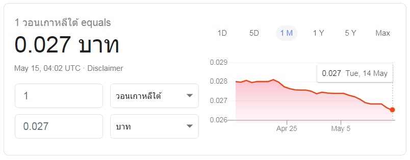 เงินวอนเกาหลีดื่งลงต่อเนื่อง ตอนนี้อยู่ที่ 1 วอน เท่ากับ 0.027 บาท