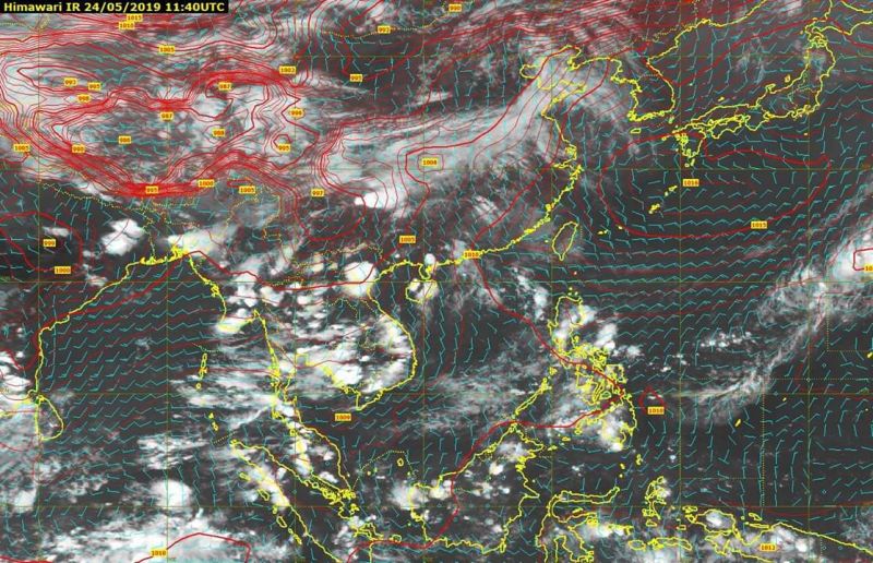 รายงานการติดตามสภาวะอากาศประจำวันที่ 24 พฤษภาคม 2562 เวลา 19.00 น. ภาคเหนือ : มีเมฆมาก เป็นเมฆชั้นต่ำและเมฆฝน ตรวจพบกลุ่มฝนบริเวณ จ.เชียงราย พะเยา น่าน ตากแม่ฮ่องสอน เชียงใหม่ ลำปาง ลำพูน แพร่ อุตรดิตถ์ สุโขทัย พิษณุโลก กำแพงเพชร พิจิตร เพชรบูรณ์ ลมตะวันตก ความเร็ว 10-20 กม./ชม.