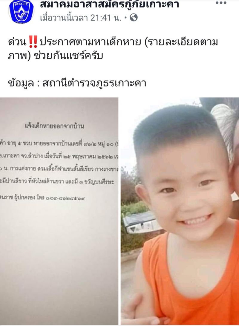 เด็กหาย! ด.ช.ชลสิทธิ์ วงศ์คำ อายุ 5 ขวบ หายจากเกาะคา จ.ลำปาง