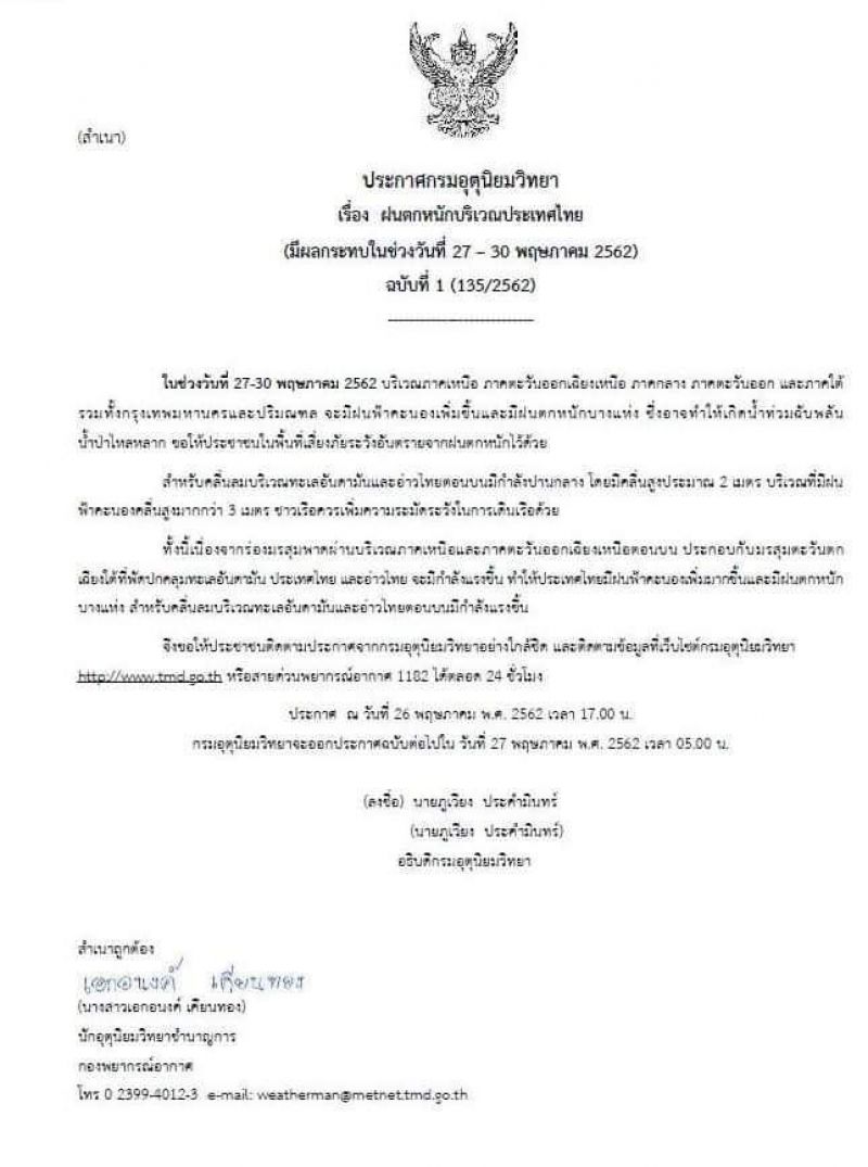 กรมอุตุนิยมวิทยาจะออกประกาศฉบับต่อไปใน วันที่ 27 พฤษภาคม พ.ศ. 2562 เวลา 05.00 น.