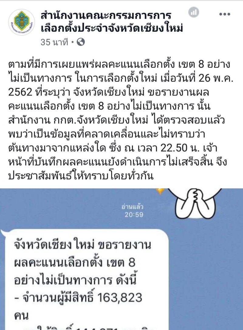ตามที่มีการเผยแพร่ผลคะแนนเลือกตั้ง เขต 8 อย่างไม่เป็นทางการ ในการเลือกตั้งใหม่ เมื่อวันที่ 26 พ.ค. 2562 ที่ระบุว่า จังหวัดเชียงใหม่ ขอรายงานผลคะแนนเลือกตั้ง เขต 8 อย่างไม่เป็นทางการ นั้น สำนักงาน กกต.จังหวัดเชียงใหม่ ได้ตรวจสอบแล้วพบว่าเป็นข้อมูลที่คลาดเคลื่อนและไม่ทราบว่าต้นทางมาจากแหล่งใด ซึ่ง ณ เวลา 22.50 น. เจ้าหน้าที่บันทึกผลคะแนนยังดำเนินการไม่เสร็จสิ้น จึงประชาสัมพันธ์ให้ทราบโดยทั่วกัน