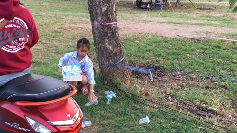 | • สาวน้อยเก็บแก้วนเำดื่มพลาสติก ทิ้งข้างทาง จากขบวนสรงน้ำพระบาทตากผ้า |