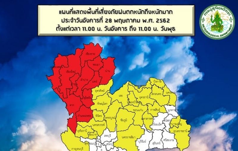 ในช่วงวันที่ 28-31 พฤษภาคม 2562 บริเวณภาคเหนือ ภาคตะวันออกเฉียงเหนือ ภาคกลาง ภาคตะวันออก และภาคใต้ตอนบน จะมีฝนฟ้าคะนองเพิ่มขึ้นและมีฝนตกหนักถึงหนักมากบางแห่ง ขอให้ประชาชนในพื้นที่เสี่ยงภัยระวังอันตรายจากฝนตกหนัก ซึ่งอาจทำให้เกิดน้ำท่วมฉับพลัน น้ำป่าไหลหลากได้ โดยจะมีผลกระทบตามภาคต่าง ๆ ดังนี้