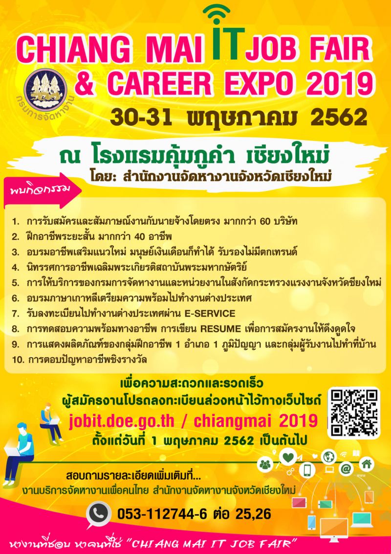 สำนักงานจัดหางานจังหวัดเชียงใหม่ กำหนดจัดงาน “ CHIANG MAI IT JOB FAIR & CAREER EXPO 2019 ” วันที่ 30 - 31 พฤษภาคม 2562 เวลา 8.30 – 16.30 น. ณ โรงแรมคุ้มภูคำ เชียงใหม่