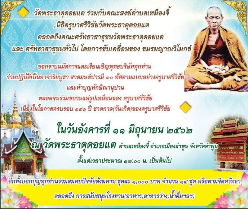ข่าวประชาสัมพันธ์ ขอเชิญพุทธศาสนิกชนทุกท่าน ร่วมปฏิบัติธรรมอาจาริยบูชาและทำบุญทักษิณานุปทานแด่ครูบาเจ้าศรีวิชัย (ตนบุญแห่งล้านนา) ในโอกาสครบรอบ ๑๔๑ ปีแห่งชาตกาล ในวันอังคารที่ ๑๑ มิถุนายน ๒๕๖๒ ณ วัดพระธาตุดอยแต ต.เหมืองจี้ อ.เมือง จ.ลำพูน เริ่มตั้งแต่เวลา ๑๗.๐๐ น. เป็นต้นไป