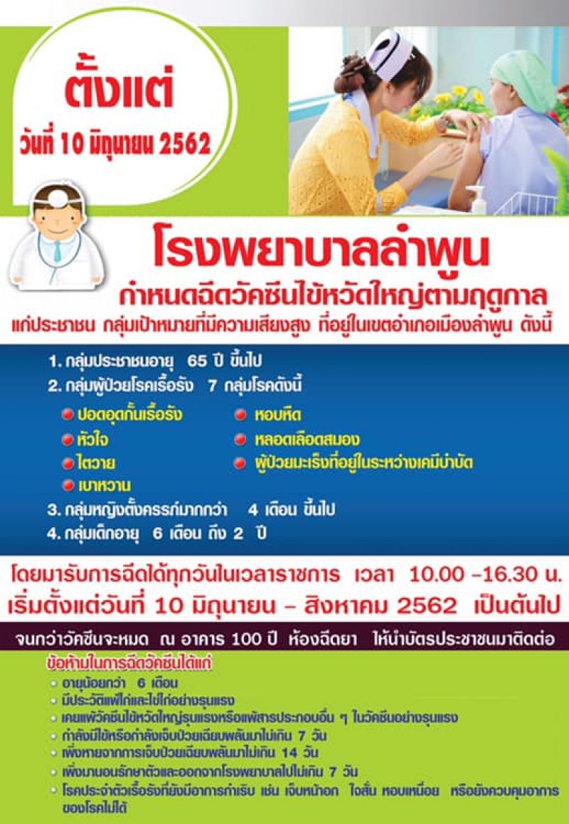โรงพยาบาลลำพูนได้เปิดให้บริการกลุ่มเสี่ยงมาฉีดวัคซีนโดยไม่เสียค่าใช้จ่าย ได้ตั้งแต่ วันนี้ - 31สิงหาคม 2562  (จนกว่าวัคซีนจะหมด) ในวันจันทร์-ศุกร์  ตั้งแต่เวลา  10.00-16.30 น. (ในวันและเวลาราชการ) กรุณานำบัตรประชาชนมาติดต่อ ณ ห้องทำบัตรผู้ป่วย