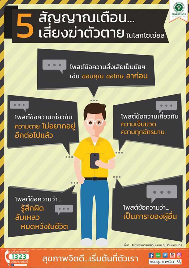 ทั้งนี้ ก่อนที่จะมีการฆ่าตัวตายนั้นมี "5 สัญญานเตือน! เสี่ยงฆ่าตัวตาย" ซึ่งสังคมควรที่จะต้องช่วยกันสอดส่อง หากพบเห็นการโพสน์ข้อความ เช่น "โพสน์สั่งเสียเป็นนัยๆ เช่น ขอโทษ ลาก่อน, โพสต์ว่าไม่อยากอยู่อีกต่อไปแล้ว, โพสต์ถึงความเจ็บปวด ทนทุกข์ทรมาน, โพสต์ถึงความล้มเหลว ผิดหวังในชีวิต และ โพสต์กล่าวโทษตัวเอง เป็นภาระของคนอื่น" ซึ่งนั่นไม่เรื่องล้อเล่น "แต่เป็นสัญญาณเตือนเสี่ยงฆ่าตัวตาย"
