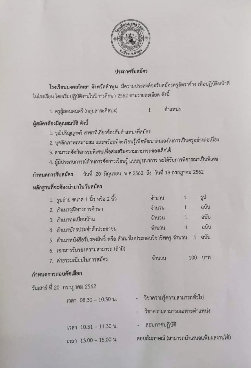 ประกาศรับสมัครครูอัตราจ้าง ตำแหน่ง ครูผู้สอนดนตรี จำนวน 1 อัตรา รับสมัครตั้งแต่วันนี้ถึงวันที่ 19 กรกฏาคม 2562 สอบถามรายละเอียดเพิ่มเติมได้ที่โรงเรียนมงคลวิทยา 053-511091