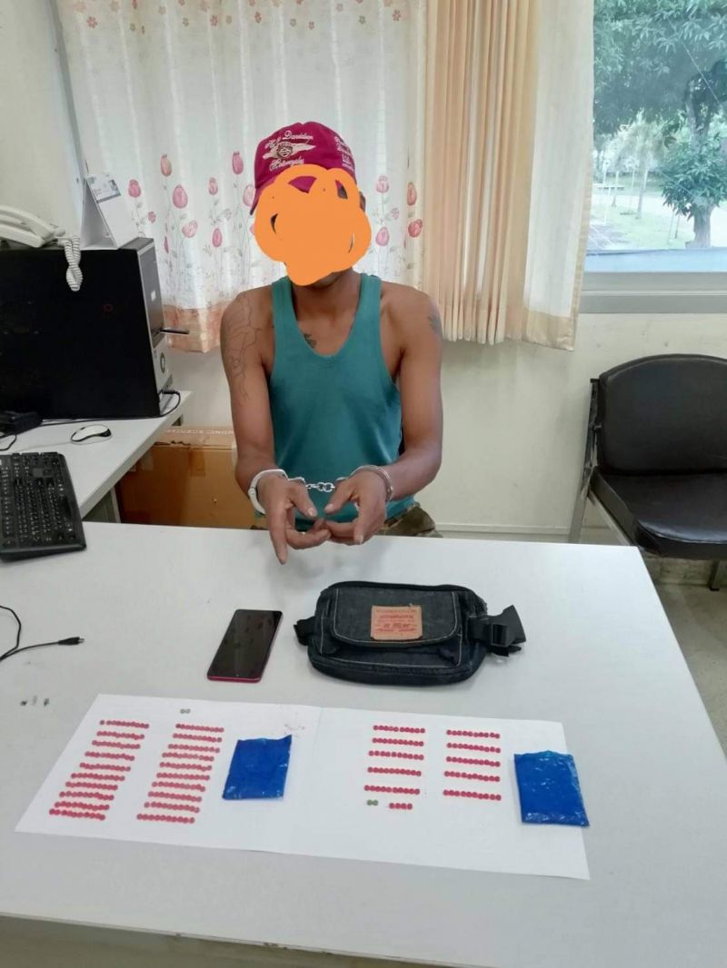 ได้ของกลาง (1.) ยาบ้า จำนวน 308 เม็ด (2,) กระเป๋าคาดเอวผ้ายีนส์สีน้ำเงิน จำนวน 1 ใบ (3.)โทรศัพท์มือถือ 1 เครื่อง