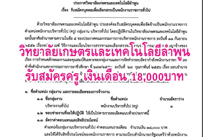 | • วิทยาลัยเกษตรและเทคโนโลยีลำพูน รับสมัครครู เงินเดือน 18,000บาท |