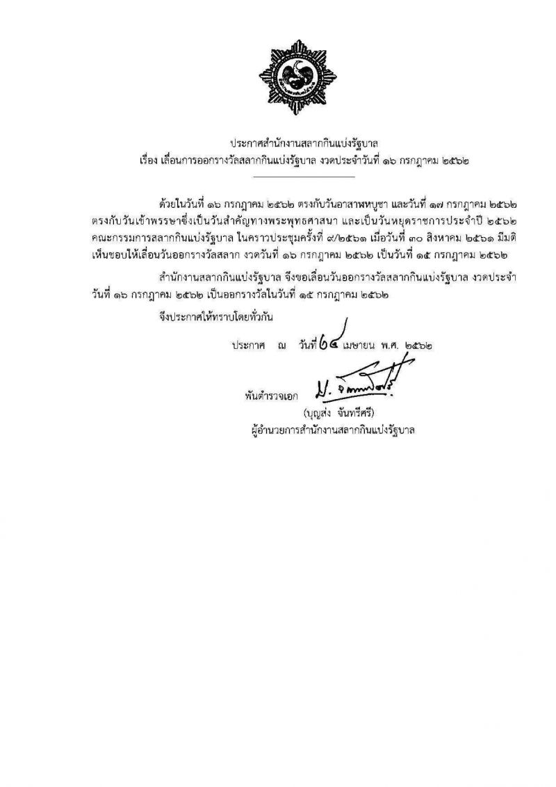 "กองสลาก"เลื่อนออกหวยงวดวันที่ 16 ก.ค.2562 เป็น15 ก.ค.2562 เนื่องจากตรงกับวันอาสาฬหบูชา และวันที่ 17 ก.ค.62 ตรงกับวันเข้าพรรษา ซึ่งเป็นวันสำคัญทางพระพุทธศาสนา และเป็นวันหยุดราชการ