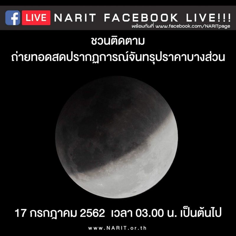 คืนนี้ !! ตีสามถึงรุ่งเช้า (17 ก.ค. 62) ชวนชม จันทรุปราคาบางส่วน ปรากฏการณ์ "จันทรุปราคาบางส่วน" ได้ทางเฟซบุคสถาบันวิจัยดาราศาสตร์แห่งชาติ ชมได้ตั้งแต่เวลาตี 3 เป็นต้นไป ลิงค์เพจ https://www.facebook.com/148300028566953