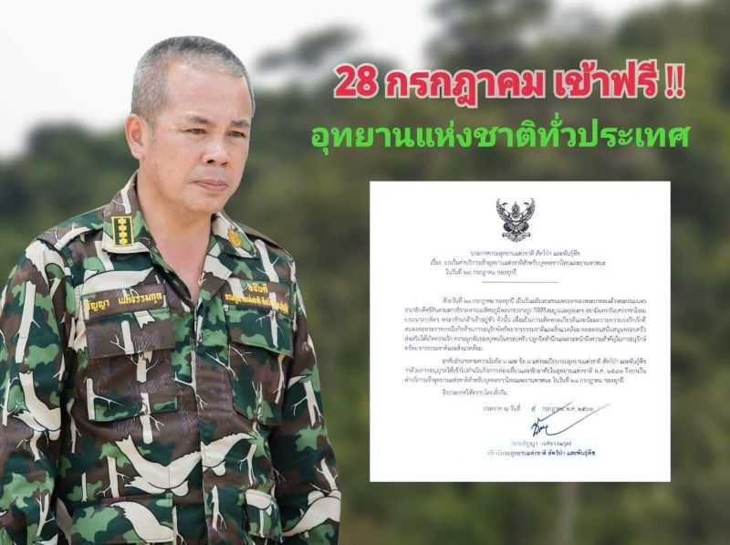 ประกาศ !! กรมอุทยานแห่งชาติ ฯ ยกเว้นค่าบริการเข้าอุทยานแห่งชาติสำหรับบุคคลชาวไทยและยานพาหนะในวันที่ ๒๘ กรกฎาคมของทุกปี