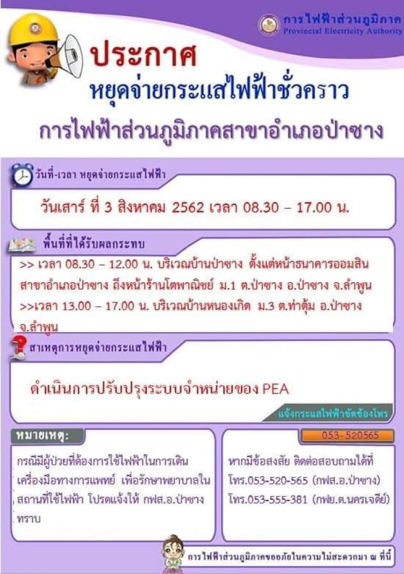 เช็คพื้นที่!! 3-5-7สิงหา ตัดกระแสไฟ ในบางพื้นที่ของป่าซาง(ลำพูน)