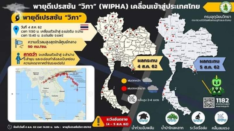 ในเวลา 13.00 น. ของวันนี้ (4 ส.ค. 62) พายุดีเปรสชัน วิภา ได้เคลื่อนเข้าปกคลุม อ.เด่นชัย จ.แพร่