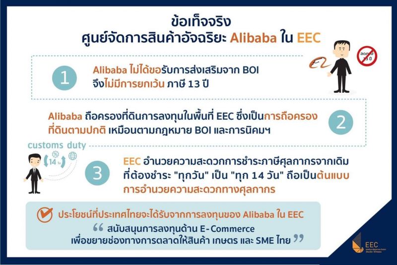 -Alibaba ไม่ได้ขอรับการส่งเสริมจาก BOI จึงไม่มีการยกเว้นภาษี 13 ปี แต่อย่างใด