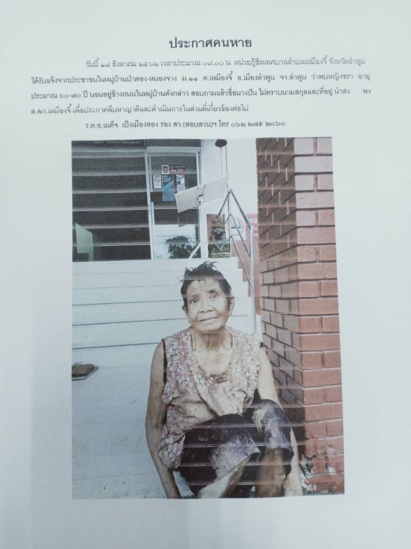 เช้าวันนี้ 17 สิงหาคม 2562 เวลาประมาณ 07:00 น กู้ชีพเทศบาลเมืองที่รับแจ้งจากประชาชน พบหญิงชราอายุประมาณ 60-70 ปี นอนอยู่ข้างถนน บ้านป่าตอง-หนองจาง ตำบลเหมืองจี้ อำเภอเมือง จังหวัดลำพูน