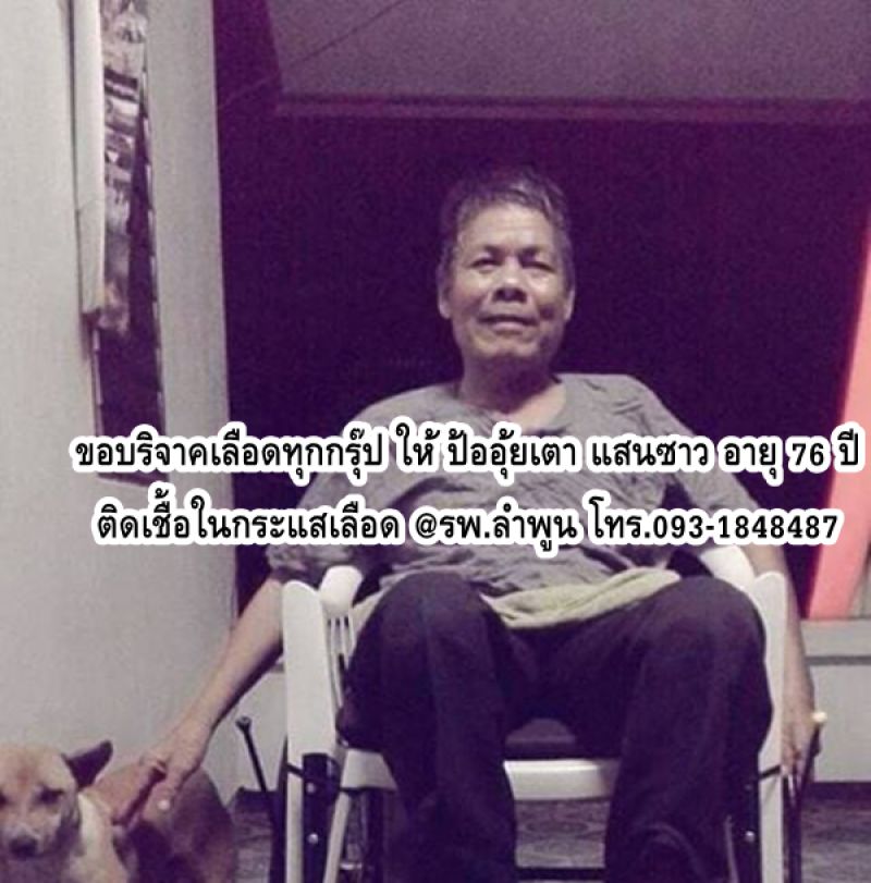 ขอบริจาคเลือดทุกกรุ๊ป ให้ ป้ออุ้ยเตา แสนซาว อายุ 76 ปี อยู่ห้องicu @รพ.ลำพูน โทร.093-1848487