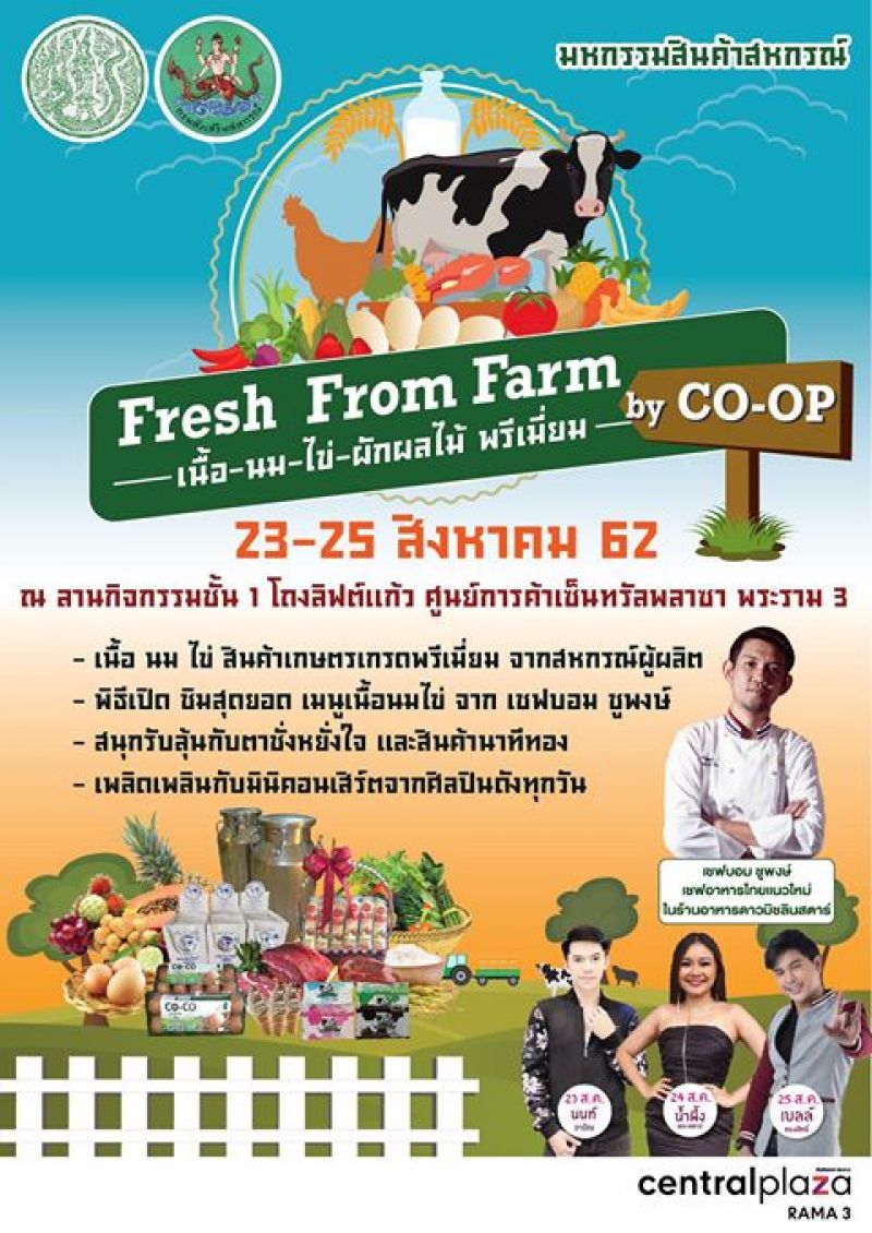 มาร่วมช็อป ชม ชิมสินค้าจากกลุ่มสหกรณ์ จำนวน19สหกรณ์ทั่วประเทศ ที่คัดมาเพื่อคุณในงาน “Fresh From Farm By CO-OP”ระหว่างวันที่ 23สิงหาคม – 25 สิงหาคม 2562 ตั้งแต่เวลา 10.00 - 22.00 น. ณ ลานกิจกรรมชั้น 1 โถงลิฟต์แก้ว ศูนย์การค้าเซ็นทรัล พระราม 3