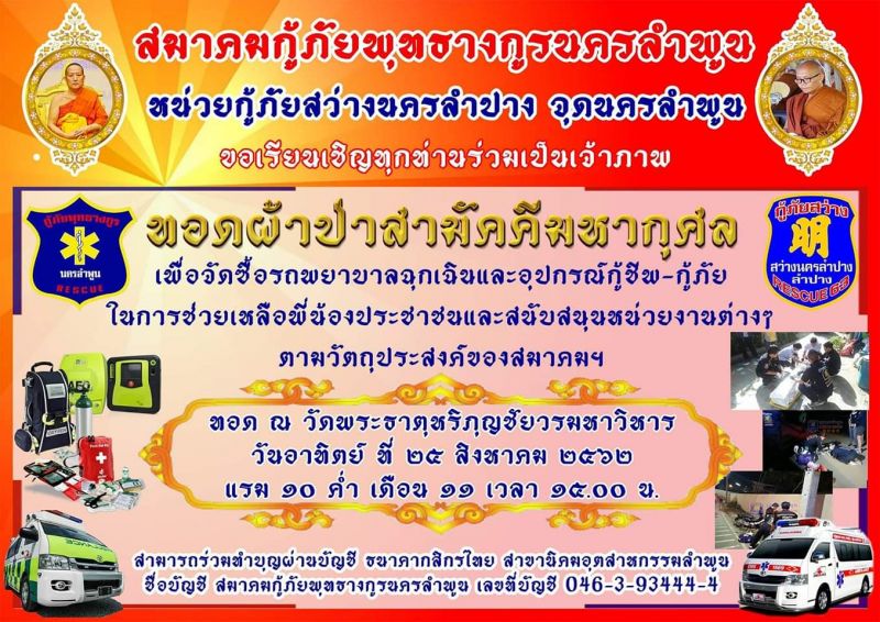 กู้ภัยสว่างนครลำพูน ขอเรียนเชิญทุกท่าน​ร่วมทำบุญทอดผ้าป่าสามัคคีมหากุศล​ เพื่อจัดซื้อรถพยาบาลฉุกเฉิน​ และอุปกรณ์กู้ชีพ-กู้ภัย​ ในการช่วยเหลือพี่น้องประชาชนและสนับสนุนหน่วยงานต่างๆตามวัตถุประสงค์ของหน่วยฯ รายละเอียดตามใบบอกบุญนะครับ