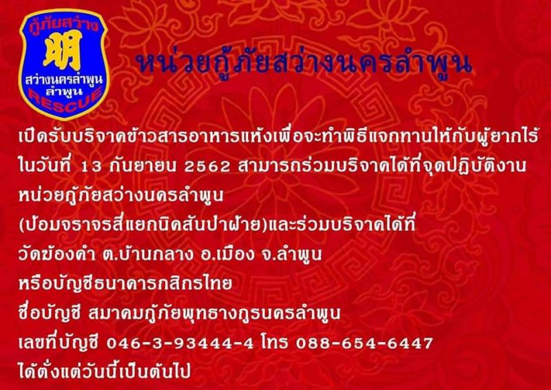 #สว่างนครลำพูน ขอเชิญผู้ใจบุญร่วมบริจาค #ข้าวสารอาหารแห้ง #ปลากระป๋อง #น้ำปลา #มาม่า #น้ำดื่ม #น้ำมันพืช #และสิ่งของใช้ประจำบ้าน เพื่อจะทำพิธีแจกทานให้กับผู่ยากไร้ เขต นิคมลำพูนและเขตเมืองลำพูน ท่านสามารถร่วมบริจาคได้ที่ #ป้อมจราจรแยกนิคมสันป่าฝ้าย สำนักงานใหญ่ #กู้ภัยสว่างนครลำพูน หรือทาง วัดฆ้องคำ ต.บ้านกลาง อ.เมือง จ.ลำพูน หรือร่วมบริจาคผ่านบัญชี #สมาคมพุทธางกูรนครลำพูน เลขที่บัญชีกสิกร 046-3-93444-4 หรือโทรสอบถามได้ที่ 088-6546447 วันงานที่13กันยายน2562 สามารถร่วมบริจาคได้ตั้งแต่วันนี้เป็นต้นไป