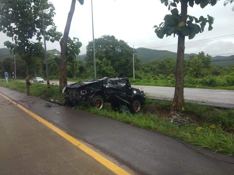 กระบะดำ เสียหลักพลิกคว่ำ ชนต้นไม้ เจ็บ1 สาหัส1 @ ถนนซุปเปอร์ แม่ทาลำพูน
