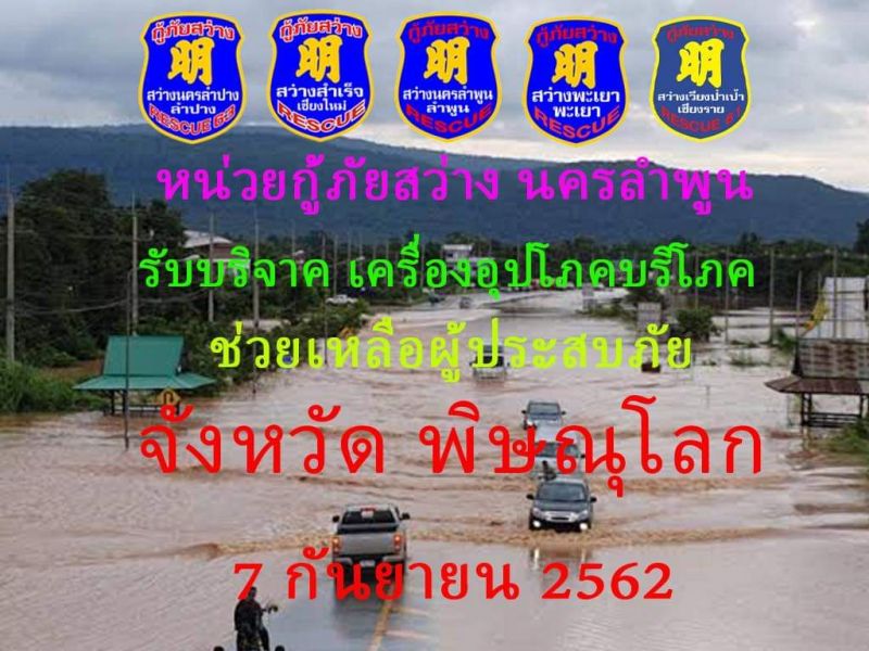 #หน่วยกู้ภัยสว่างนครลำพูน เปิดรับบริจาคเครื่องอุปโภคบริโภค ข้าวสารอาหารแห้ง น้ำดื่ม ยา ฯลฯ #ช่วยเหลือผู้ประสบภัยน้ำท่วมที่จังหวัดพิษณุโลก สามารถบริจาคได้ที่ศูนย์กู้ภัยสว่างนครลำพูน ป้อมจราจรสี่แยกนิคมสันป่าฝ้าย หรือที่วัดฆ้องคำ ตำบลบ้านกลาง อำเมือง จ.ลำพูน และผู้ที่อยู่ต่างจังวัด สามารถบริจาคได้ที่หน่วยกู้ภัยสว่างนครลำปาง หน่วยกู้ภัยสว่างสำเร็จเชียงใหม่ หน่วยกู้ภัยสว่างเวียงป่าเป้าเชียงราย หน่วยกู้ภัยสว่างพะเยา ทางหน่วยกู้ภัยสว่างนครลำพูน พร้อมทีมงานกู้ภัยสว่าง จะเดินทางไปร่วมมอบของบริจาคพื้นที่ประสบภัย จังหวัดพิษณุโลกในวันที่7 กันยายน 2562 ส่วนเวลาจะแจ้งให้ทราบ สอบถามข้อมูลเพิ่มเติมโทร 088-654-6447