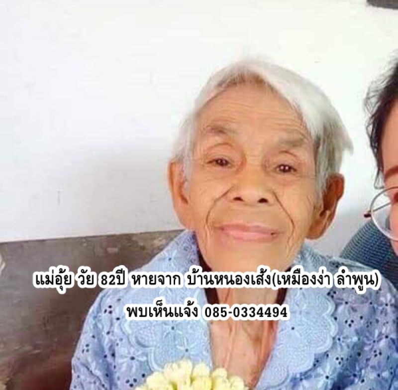 อายุ82ปี บ้านเลขที่ 159 หมู่10 บ้านหนองเส้ง ต.เหมืองง่า อ.เมือง จ.ลำพูน พบเห็นกรุณาติดต่อ วิภาพร 085-0334494