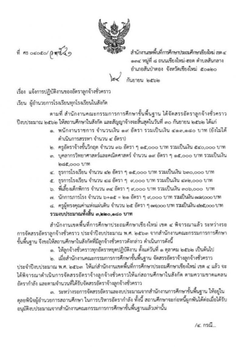 เพจสมัครงาน สอบราชการได้โพสต์ข้อความ และ เอกสาร  ว่า สำนักงานเขตพื้นที่การศึกษาประถมศึกษาเชียงใหม่ เขต 4 มีคำสั่งให้ “ลูกจ้างชั่วคราว” ทุกอัตราหยุดปฏิบัติงานตั้งแต่วันที่ 1 ตุลาคม 2562 เป็นต้นไป    ขอให้รอ จัดสรรอัตราและงบประมาณจากสำนักงานการศึกษาขั้นพื้นฐาน   จำนวน 3.2ล้านบาท