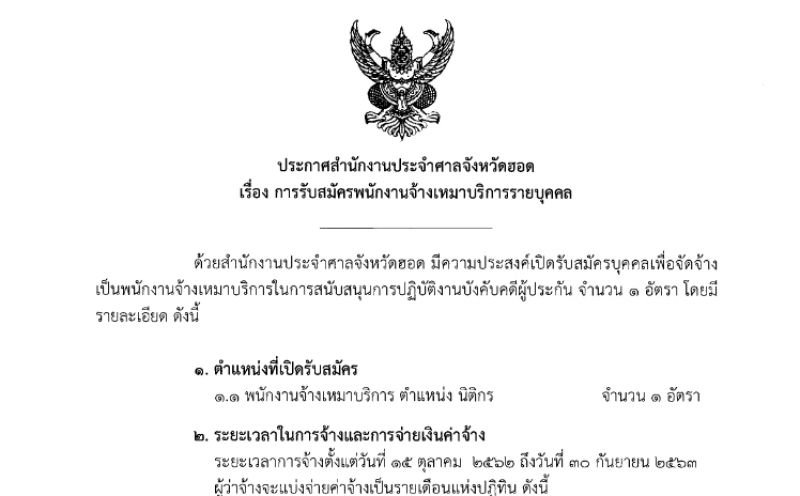 ศาลจังหวัดฮอด รับสมัคร นิติกร จำนวน 1 อัตรา เงินเดือน 19,950บาท