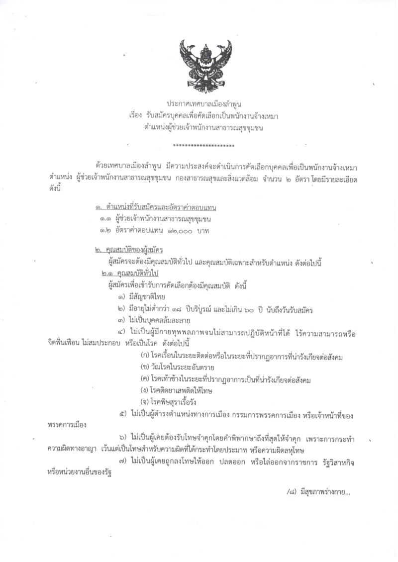 ประกาศเทศบาลเมืองลำพูน เรื่อง รับสมัครบุคคลเพื่อคัดเลือกเป็นพนักงานจ้างเหมา ตำแหน่ง ผู้ช่วยเจ้าพนักงานสาธารณสุขชุมชน