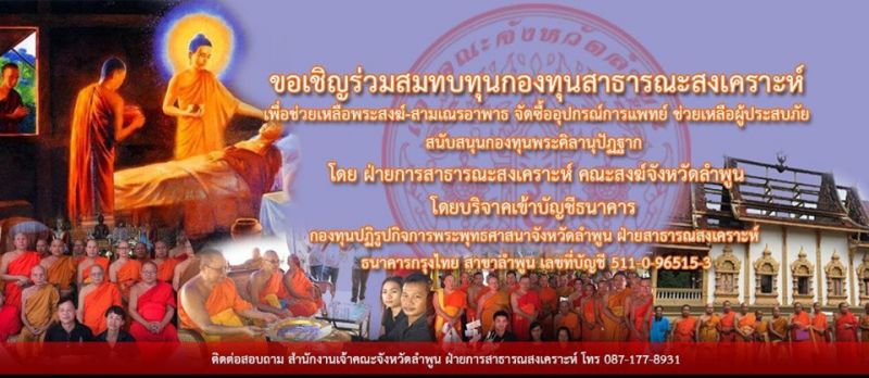 ขอเชิญร่วมบริจาคสมทบทุนกองทุนสาธารณะสงเคราะห์ เพื่อช่วยเหลือพระสงฆ์-สามเณรอาพาธ ในพื้นที่จังหวัดลำพูน สมทบทุนจัดซื้ออุปกรณ์การแพทย์ การปฐมพยาบาล ช่วยเหลือผู้ประสบภัยในท้องที่ สนับสนุนกองทุนพระคิลานุปัฏฐาก ดำเนินงานโดย คณะกรรมการฝ่ายการสาธารณะสงเคราะห์ คณะสงฆ์จังหวัดลำพูน