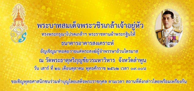 ให้ ธนาคารอาคารสงเคราะห์ อัญเชิญมาทอดถวายแด่พระสงฆ์ผู้จำพรรษาถ้วนไตรมาส ณ วัดพระธาตุหริภุญชัยวรมหาวิหาร จังหวัดลำพูน วัน เสาร์ ที่26 เดือนตุลาคม พุทธศักราช 2562 เวลา 09.00น