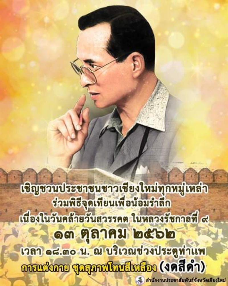 จังหวัดเชียงใหม่ขอเชิญชวนประชาชนทุกท่านร่วมพิธีจุดเทียนเพื่อน้อมรำลึกในพระมหากรุณาธิคุณพระบาทสมเด็จพระบรมชนกาธิเบศร มหาภูมิพลอดุลยเดชมหาราช บรมนาถบพิตร ในเวลา 19.30 น. ณ ข่วงประตูท่าแพ อำเภอเมืองเชียงใหม่ จังหวัดเชียงใหม่ โดยแต่งกายในชุดสุภาพโทนสีเหลือง