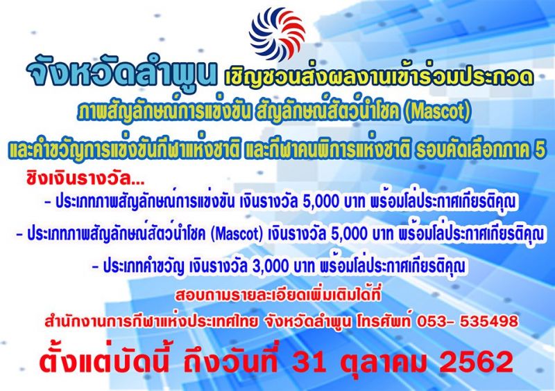 จังหวัดลำพูน ขอเชิญชวนส่งผลงานเข้าร่วมประกวดภาพสัญลักษณ์การแข่งขัน สัญลักษณ์สัตว์นำโชค (Mascot) และคำขวัญการแข่งขันกีฬาแห่งชาติ รอบคัดเลือกภาค 5 ครั้งที่ 47 และกีฬาคนพิการแห่งชาติ รอบคัดเลือกภาค 5 ครั้งที่ 37