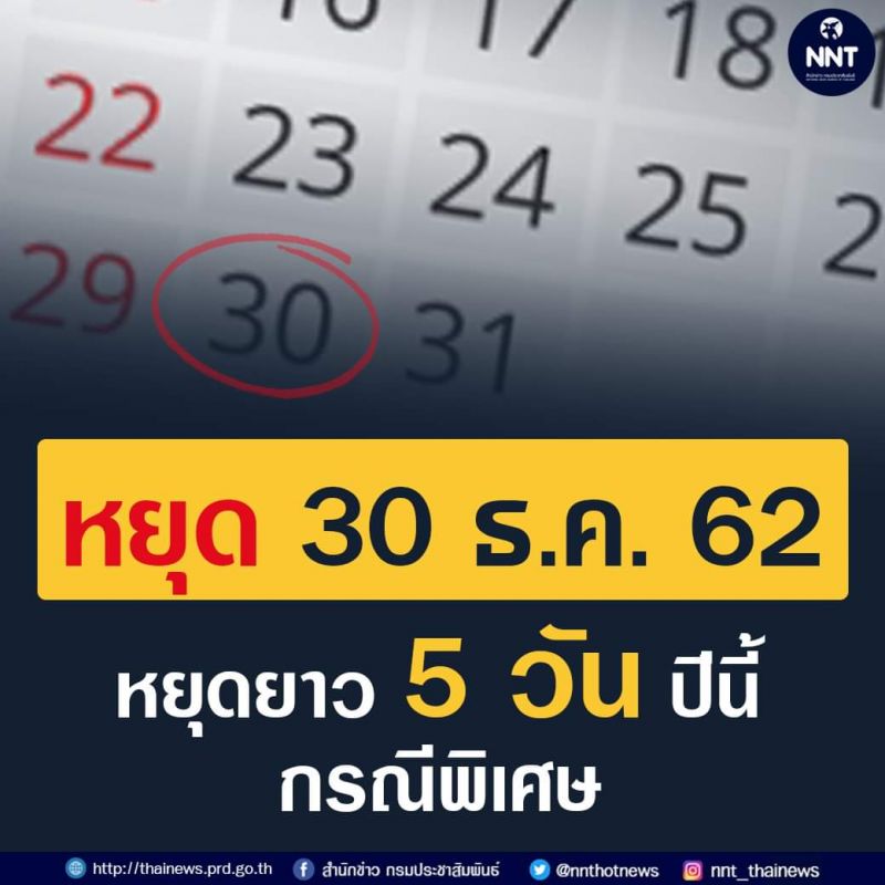 👍👍 ครม. อนุมัติเพิ่มวันหยุดราชการเป็นกรณีพิเศษ 1 วัน ในวันจันทร์ที่ 30 ธันวาคม 2562 เนื่องจากเป็นฟันหลอในช่วงวันหยุดเทศกาลปีใหม่ จึงทำให้มีวันหยุดยาวเป็น 5 วัน ตั้งแต่วันที่ 28 ธ.ค. 2562 - 1 ม.ค. 2563