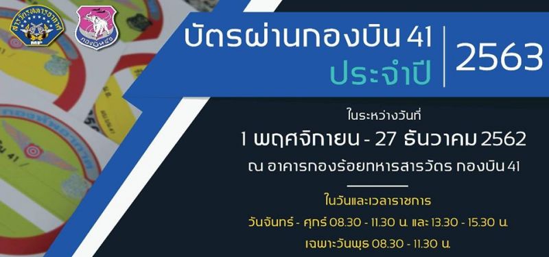 เปิดทำบัตรผ่านกองบิน 41 ประจำปี 2563 1 พฤศจิกายน - 27 ธันวาคม 2562