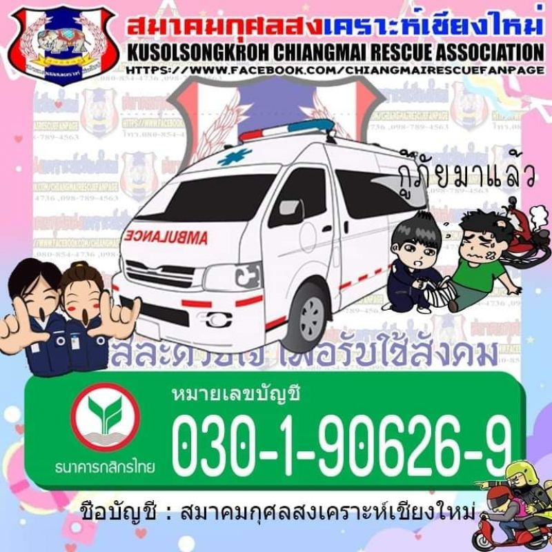 | • กู้ภัยฯเชียงใหม่ เชิญร่วมทำบุญ ซื้อรถพยาบาลฉุกเฉินและอุปกรณ์กู้ชีพกู้ภัย |