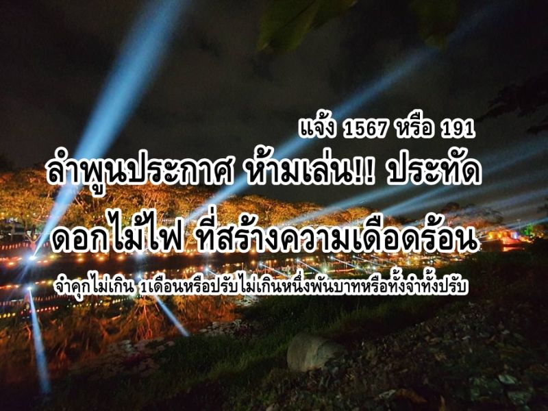 | • ลำพูนเข้ม! ห้ามขาย/เล่นดอกไม้ไฟและประทัด ที่ก่อกวนประชาชน พบเห็นแจ้ง1567หรือ191 |