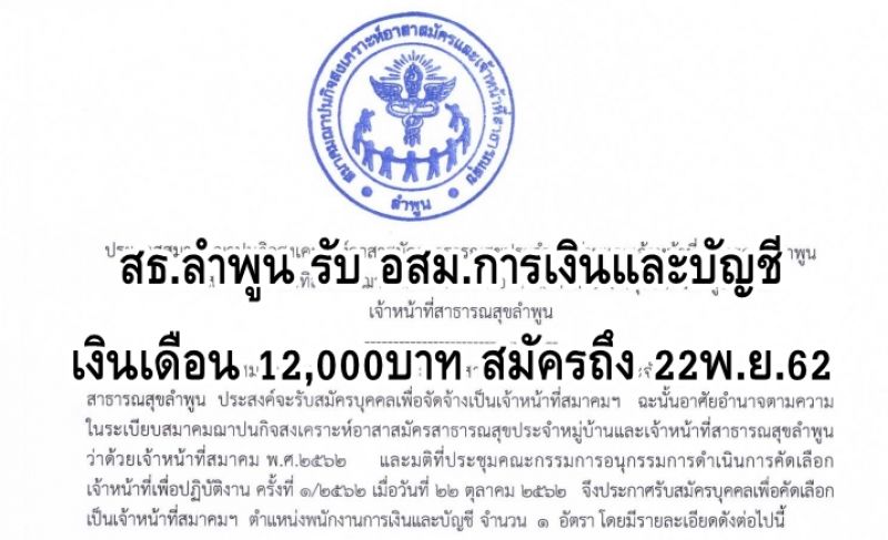 สธ.ลำพูน รับ อสม.การเงินและบัญชี เงินเดือน 12,000บาท สมัครถึง 22พ.ย.62